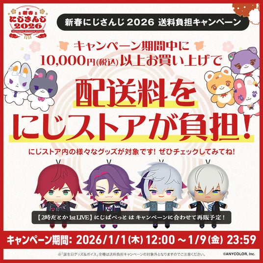 ANYCOLOR株式会社(本社:東京都港区 代表取締役:田角陸、以下「当社」)が運営するVTuber / バーチャルライバーグループ「にじさんじ」は、新年の年明けを彩る新グッズの販売や、送料負担キャンペーンの開催をお知らせいたします。
