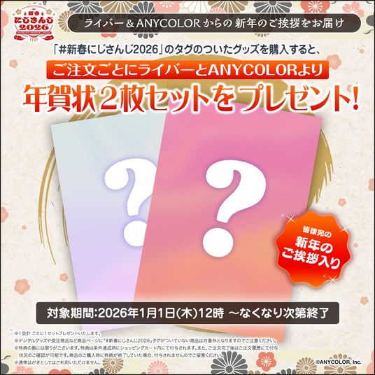 「#新春にじさんじ2026」のタグのついたグッズを購入すると、ご注文ごとにライバーとANYCOLOR株式会社より、皆様宛の新年のご挨拶を添えた「年賀状 2枚セット」をプレゼントいたします。