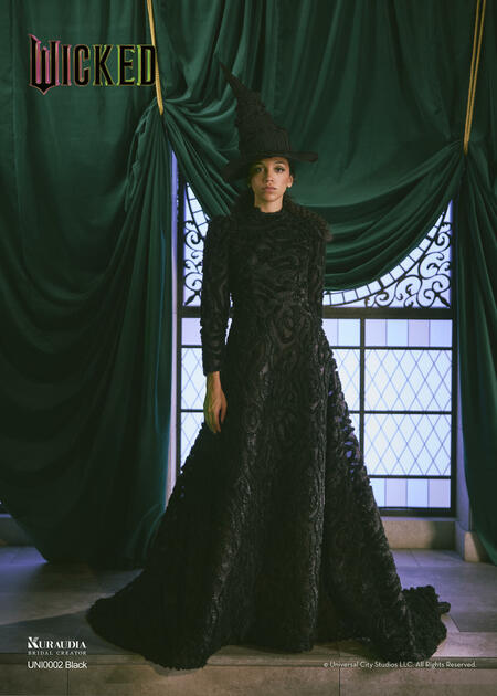 全身に施された立体的なリボン刺繍が美しい、深みのあるブラックドレスは、『ウィキッド ふたりの魔女』のエルファバらしさたっぷり!