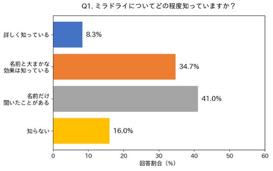 ミラドライについてどの程度知っているか調査したところ、「詳しく知っている」はわずか8.3%にとどまりました。「名前と大まかな効果は知っている」が34.7%、「名前だけ聞いたことがある」が41.0%と最多で、「知らない」も16.0%存在しました。関心を持っていても、詳細な知識を持つ人は少数派であることがわかります。
