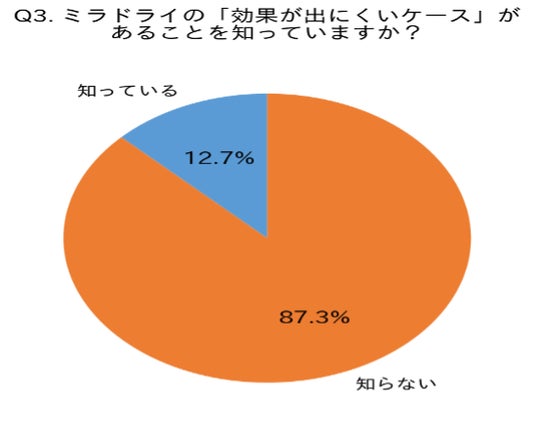ミラドライには「効果が出にくいケース」があることを知っているか調査したところ、「知らない」が87.3%と圧倒的多数を占めました。「知っている」はわずか12.7%にとどまり、効果の個人差に関する情報が十分に認知されていないことが浮き彫りになりました。