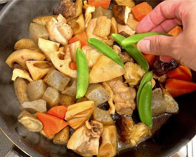 7. 落とし蓋をはずして、スナップエンドウを加えたら、ときどき全体を混ぜながら4分ほど火を通す。全体にツヤっとした照りがついたらできあがり。