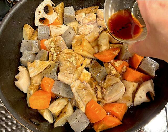 5. 鶏肉に焼き色がついたら、れんこん、にんじん、ごぼう、こんにゃく、しいたけを加え、★以下の調味料を入れる。