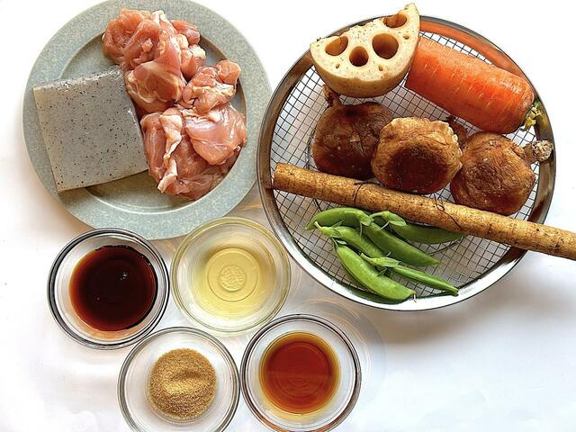 忙しい時季の料理は、手間を上手に省ける食材を選ぶのもいいでしょう。今回、鶏肉は唐揚げ用にカットされたものを使用。しいたけは乾燥だと戻す手間がかかるので生のものを、ごぼうは洗いごぼうを選びました。
