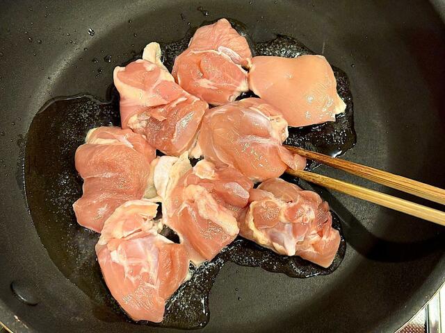 4. フライパンに油を大さじ1入れ、鶏肉を皮目を下にして中火で焼く。