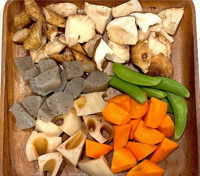 3. しいたけは軸をとり4等分にする。皮をむいたれんこんとにんじん、ごぼうを食べやすい大きさの乱切りにする。このとき、それぞれの大きさをあわせるとよい。