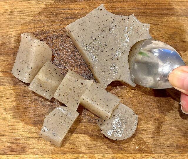 1. こんにゃくはスプーンを使ってひと口サイズにする。フライパンに湯を沸かし、こんにゃくを入れて3分ほどゆで、ざるにあげる。