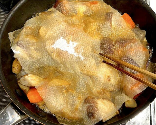 6. 煮立ったら、クッキングシート(クッキングペーパーでもOK)を落とし蓋代わりに上から被せて、弱めの中火で7分ほど煮る。