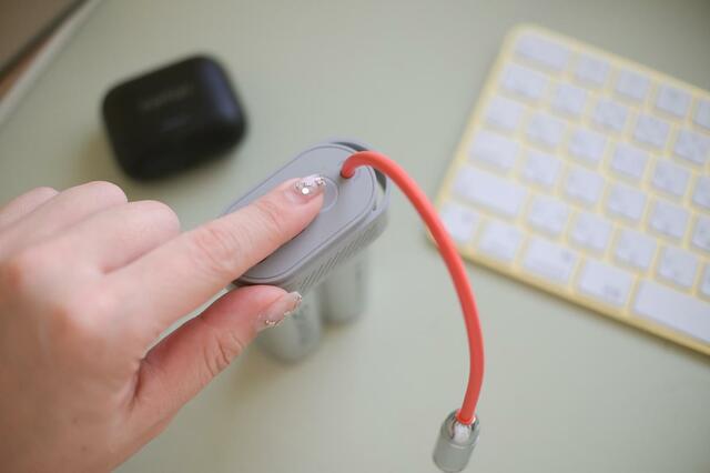 「Pouch Mini モバイルバッテリー」の目を惹くオレンジ色の内蔵USB-Cケーブルは、見た目だけじゃなく、実用性もバッチリ。耐久性と柔軟性を兼ね備えたTPEケーブルを採用し、先端のUSB-C端子は金属製。頑丈かつ長持ちする設計になっています。