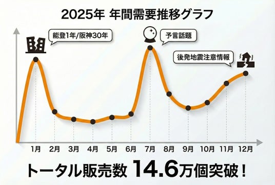 本期間中、シリーズ累計販売数は14.6万個を記録いたしました。2025年は、日本人にとって「備え」の意味が大きく変わった1年でした。阪神・淡路大震災から30年、能登半島地震から1年という節目の1月に始まり、夏にはSNSで予言話題が駆け巡り、年末には「北海道・三陸沖後発地震注意情報」が発表されるなど、私たちは常に「もしも」という問いを突きつけられ続けました。 その不安な日々の中で、「簡易トイレ 防災」の需要が爆発した背景には、単なる物資の確保ではなく、「どんな状況でも家族の尊厳を守りたい」という人々の強い願いがありました。100回より「120回」、50回より「60回」。販売データから見える、2025年の防災意識の変遷を総括します。