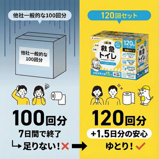 SONAERUの「120回セット」は、1週間分(98回)に対し、さらに約1.5日分(22回)のゆとりを持たせた設計(計8.5日分)です。この「あと1日以上余っている」という精神的余裕が、非常時の焦りを防ぐ「心の備え」として評価され、年間オンライン販売数14.6万個を記録しました。