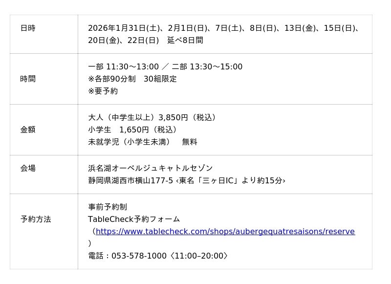 静岡県浜松市でブライダル・レストラン事業を行う株式会社スティルアン(本社:静岡県浜松市中央区田町326-30、代表取締役社長:石川 学)が運営する浜名湖オーベルジュ キャトルセゾンは、毎年ご好評をいただいている冬の人気イベント「チョコレートブッフェ2026」を2026年1月31日(土)より期間限定で開催いたします。