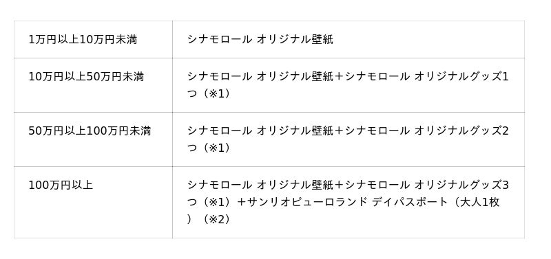 ※1シナモロール 新オリジナルグッズに加えて、ステッカー全3種、スマホキーリング、カード用ホルダーのラインナップからプレゼントいたします。なお、オリジナルステッカーの色およびグッズの種類はお選びいただけません。