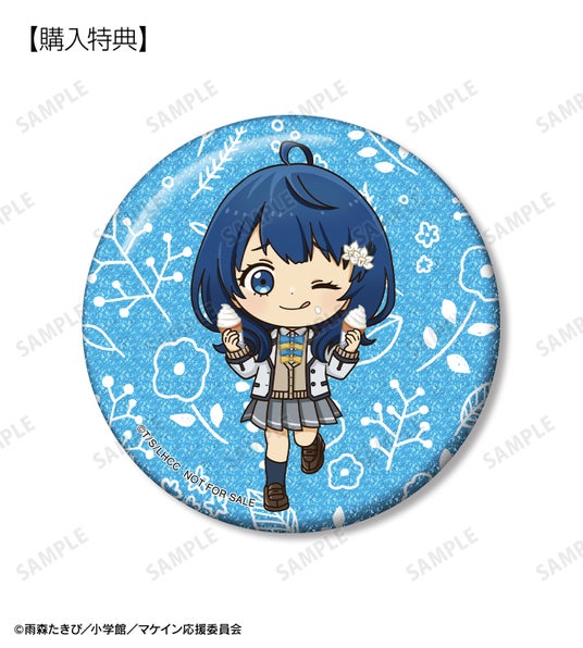 温水 和彦、八奈見 杏菜、焼塩 檸檬、小鞠 知花、温水 佳樹、月之木 古都、姫宮 華恋、朝雲 千早、志喜屋 夢子、放虎原 ひばり、馬剃 天愛星の描き起こしちびキャライラストをメインにデザインし、グリッター加工を施した缶バッジに仕上げました。