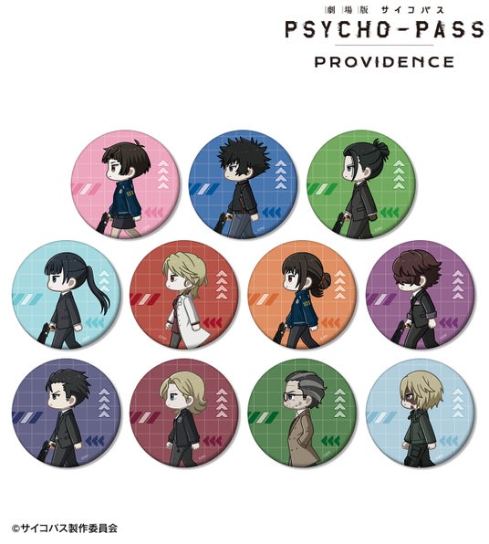 常守 朱、狡噛 慎也、宜野座 伸元、六合塚 弥生、唐之杜 志恩、霜月 美佳、雛河 翔、須郷 徹平、花城 フレデリカ、雑賀 譲二、煇・ワシリー・イグナトフが歩いているちびキャラを新たに描き起こし、マットな手触りの缶バッジに仕上げました。