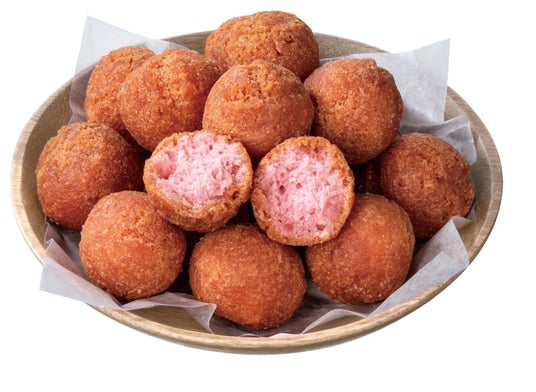 軽い食感でぱくぱく食べ進められる、いちご風味のほんのり甘い、ひとくちサイズのボールドーナツ16個入です。