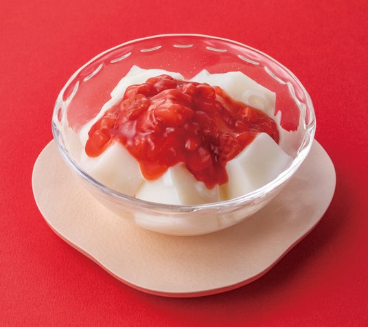 牛乳と練乳を使用したもっちり食感のみるくわらびもちに、果肉入りの甘酸っぱいいちごソースと練乳ソースをかけた商品です。