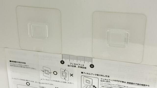 その後、いきなりフィルムフックを貼るのではなく、フック同士の間隔が4cmの位置になるように、同封されているガイドの紙を貼りましょう。