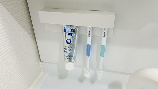 歯ブラシや歯磨き粉などを浮かせて収納できるので、水垢がたまりにくく、掃除がしやすくなるのが嬉しい!