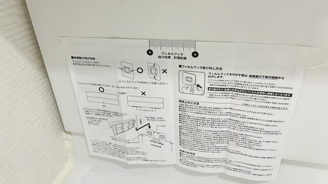 上の画像のように、ガイドに合わせてフィルムフックの保護シートを剥がし、フック部分を設置面に押し付けて密着させたらOKです。