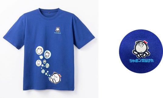 今回のT シャツはシャボン玉石けんのイメージカラーであるブルーを基調とし、表にはイメージキャラクターであるシャボンちゃんの刺繍・プリントがあしらわれています。地元である九州への感謝の気持ちと手に取る人を笑顔にしたいという想いを込めて、シャボンちゃんの色々な表情・ポーズが楽しめるデザインに仕上がっています。