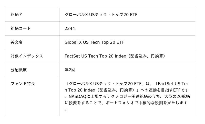 当ETFは、米国を代表する大型テック企業20銘柄へ厳選投資を行うETFです。構成銘柄は、テスラ、エヌビディア、ブロードコム、アルファベット、アップルなど、世界のテクノロジー分野をけん引する企業で構成されています。