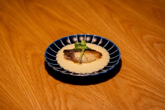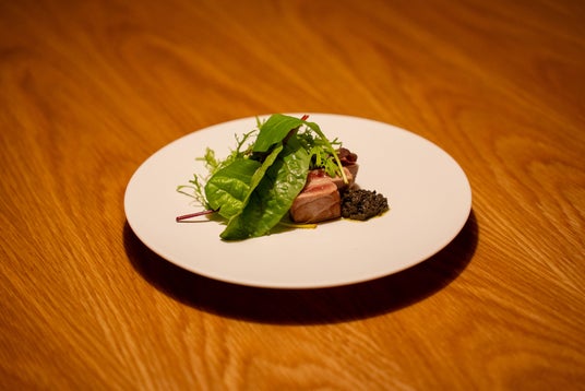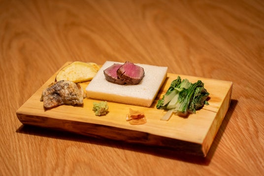 写真のコースは、マグロのレアステーキ サラダ仕立て、サワラのソテー、黒アワビのステーキに加え、国産黒毛和牛 シャトーブリアンと贅を尽くした構成。タプナードや西京味噌のソースが素材を引き立て、火入れの妙が際立つ逸品ばかり。特別な夜にふさわしい品々を、五感でご堪能ください。