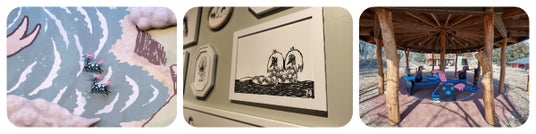 パーク内では、KOKEMUS 2F/3Fのジオラマや、2Fの展示エリア、「はなうま」をモチーフにした遊具「はなうまのメリーゴーランド」などで見つけることができます。