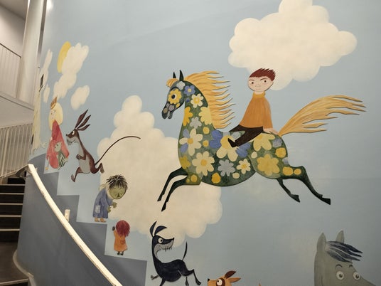 コケムスのらせん階段に再現されている、アウロラこども病院の壁画"遊び"。これはムーミンの物語の作者トーベ・ヤンソンが、病院を意識させない、子どもたちをワクワクさせる、楽しく検査室まで誘導する、などのリクエストに応えて、壁いっぱいにムーミンたちが上階に向かって駆け上がっていく様子を描いた作品です。この壁画の中にも、花柄のうまが描かれています。