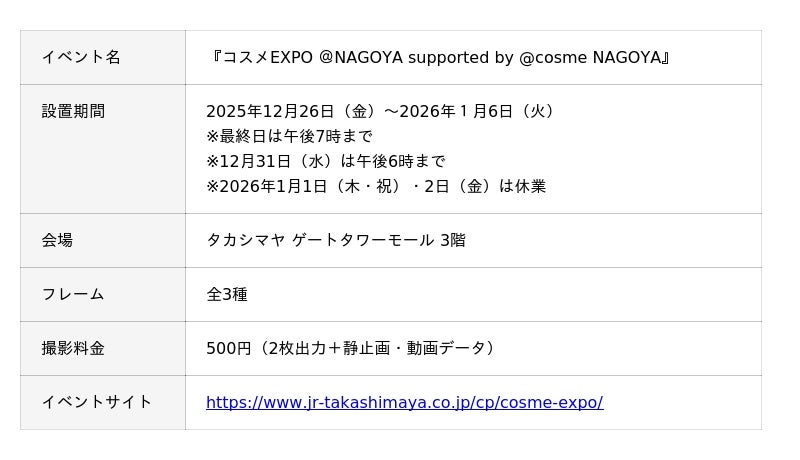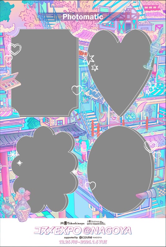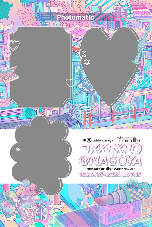 キタムラ・ホールディングス グループのピックハイブ株式会社(本社:東京都新宿区、代表取締役社長 兼 COO:大迫 由典)が運営するセルフフォトブランド「Photomatic(読み:フォトマティック)」は、2025年12月26日(金)~2026年1月6日(火)の10日間〔2026年1月1日(木・祝)・2日(金)は休業〕"名古屋駅を美の聖地に”を合言葉に、「ジェイアール名古屋タカシマヤ」と「タカシマヤ ゲートタワーモール」で開催される日本最大級のコスメの祭典『コスメEXPO @NAGOYA supported by @cosme NAGOYA』(以下:コスメEXPO)にイベント限定のコラボレーションフレームで撮影できるフォトブースを設置しました。