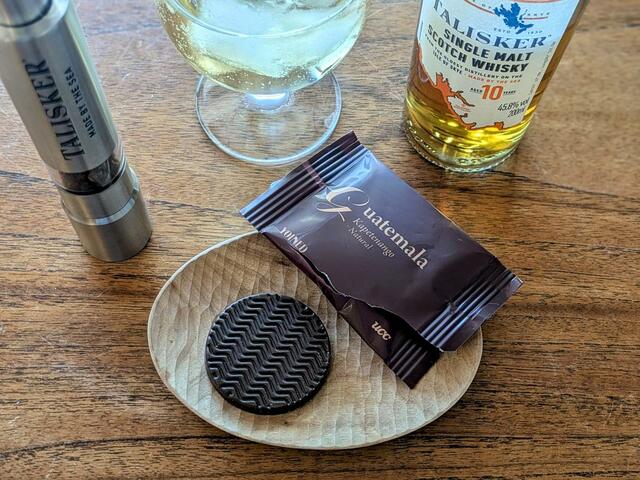 スモーキーでスパイス感のあるタリスカーに、「YOINED」を1枚口に含むと、コーヒーの香りがふわっと立ち上がります。