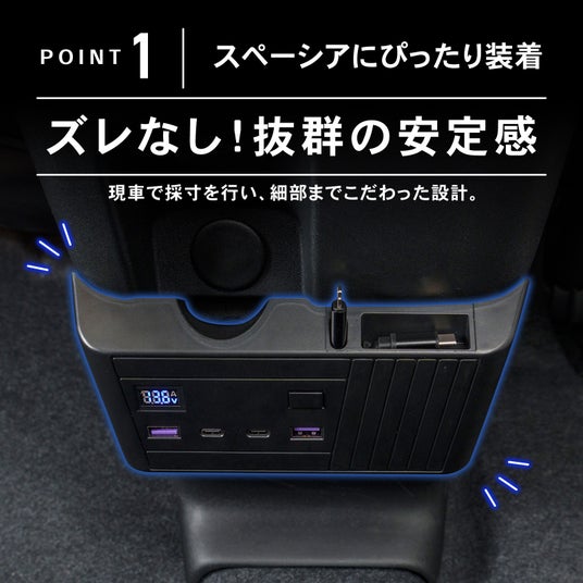 スペーシア MK54S MK94S専用 「増設電源ユニット」。現車で採寸を行い、細部までこだわった設計なのでスペーシアにぴったり装着します。電圧計+LED照明で"便利&快適"をサポート!