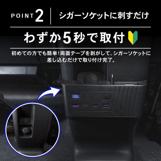 両面テープを剥がして、シガーソケットに差し込むだけで取り付け完了。