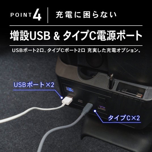 USBポート2口、タイプCポート2口 充実した充電オプション。