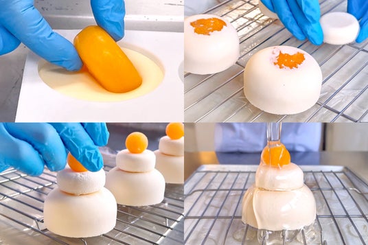 美しい艶を出すだけでなく、レアチーズとみかんぜリーの水分を守り、表面をやさしくコーティング。乾燥やひび割れを防ぎ、時間が経っても、なめらかな口当たりと“作りたて感”を保ちます。