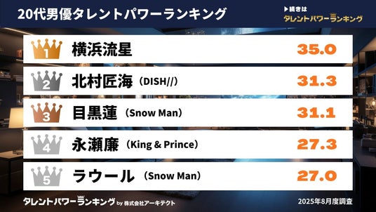 『タレントパワーランキング』ではタレントパワーランキングに登録されている、2025年12月25日時点で年齢が20代の男優について、パワースコアを調査。