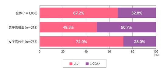 また、男子制服のスカートについては、「よい」(全体67.2%、男子高校生49.3%、女子高校生72.0%)という結果となり、高校生の7割近くが男子のスカート着用を肯定的に捉えていました。男女別では、男子制服のスカートについて、男子高校生の2人に1人が「よい」と回答していることになります。特に女子高校生では「よい」と回答した割合が7割を超えており、男子のスカートスタイルに対して前向きな意識が比較的高いことがうかがえました。