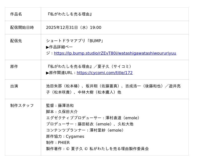 ショートドラマアプリ「BUMP」を運営する emole 株式会社(本社:東京都目黒区、代表取締役:澤村直道、以下 emole)は、株式会社Cygamesとの共同製作によるBUMPオリジナルショートドラマ『私がわたしを売る理由』を2025年12月31日(水)19:00よりBUMP独占配信いたします。