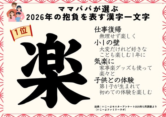 子育て世帯を対象に「2026年をどんな一年にしたいか、抱負を漢字一文字で表すと?」というアンケートを実施。ママ・パパたちの、切実で前向きな本音が浮き彫りになっています。内容を詳しく紹介します。
