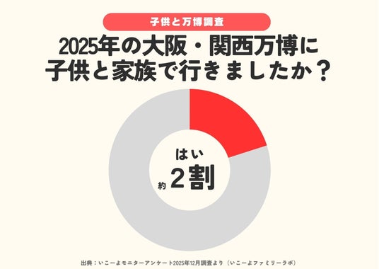 国内最大級の子供とお出かけ情報サイト「いこーよ」を運営するアクトインディ株式会社(東京都品川区 代表取締役:下元敬道 以下、アクトインディ)では、アンケート調査や取材からリアルな親子の行動を浮き彫りにする「いこーよファミリーラボ」にて子育て世帯に、「2025年に開催された日本国際博覧会(以下、大阪・関西万博)への子育て世帯の最終来場実態と、2027年に横浜で開催予定の国際園芸博覧会(以下、横浜万博)に対する期待度について調査」を実施しました。