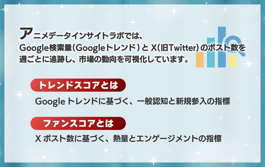 株式会社ブシロード (本社:東京都中野区、代表取締役社長:木谷高明)のグループ分析組織にあたるアニメデータインサイトラボ(代表:大貫佑介)は、2025年のアニメにおける調査を実施しました。今回は、2025年のアニメ作品を対象に、トレンド指数(Google検索量)とファン指数(X投稿量)の両面からアニメの注目度推移を検証・分析し、データから導かれた2025年アニメアワードを発表いたします。報道関係の皆様におかれましては、ぜひ本情報をお取り扱いいただきますよう、お願い申し上げます。