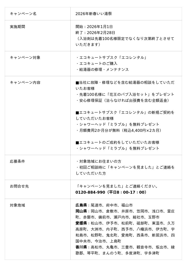 中四国地方でエコキュートのサブスク「エコレンタル」などを展開するEUグループ株式会社(本社:岡山県倉敷市、代表:河合 雄治)は、エコキュートなどの給湯器の相談・購入を後押しする「新春いい湯祭」を2026年1月1日より開始いたします。本キャンペーンは、当社が運営する給湯器事業を多くのお客様にご利用いただくことを目的としており、2026年2月28日までの期間限定で特別な優待をご用意しております。