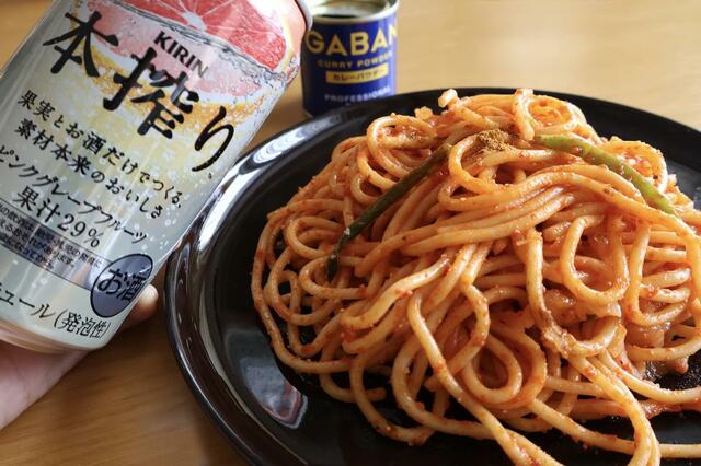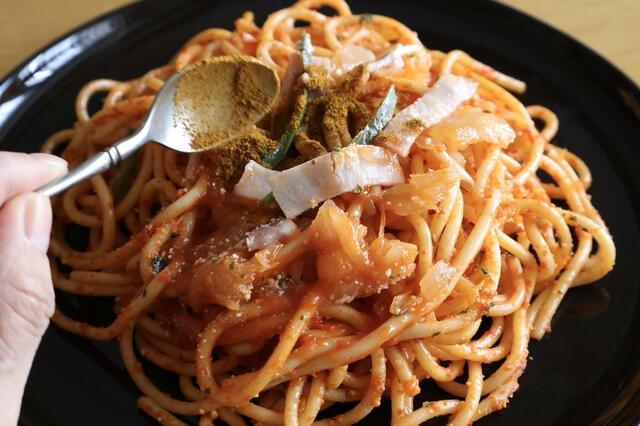 最後は〆。ナポリタンスパゲティにGABANのカレーパウダーを振りかけるアレンジがオススメです。