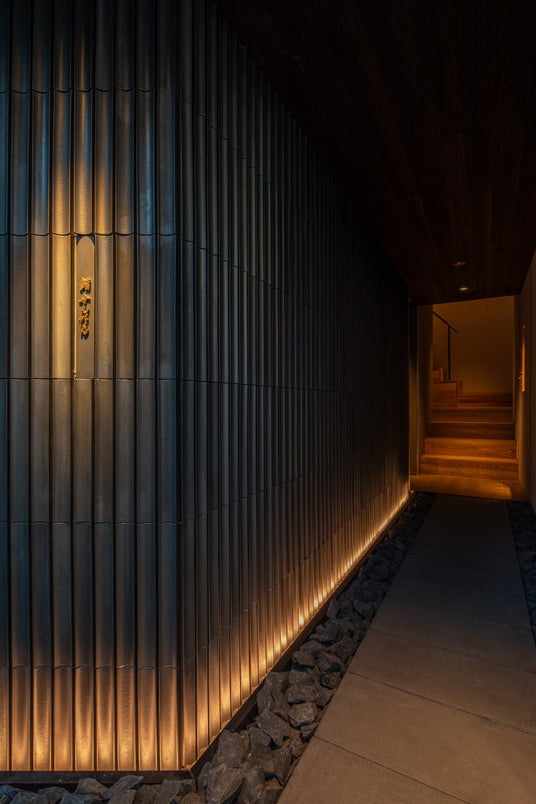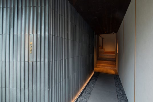 竹炭をモチーフにした廊下が、外の喧騒から離れ、食事に向き合う時間へと導きます。
