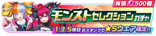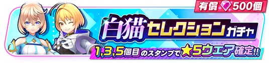 「モンストセレクションガチャ」からはジャック・ザ・リッパー(CV:高橋李依)、ラプラス(CV:鬼頭明里)の2キャラクターのみ、「白猫セレクションガチャ」からエレノア(CV:石見舞菜香)、ウィズ(CV:田村ゆかり)の2キャラクターのみの★5ウェアが登場予定です。本ガチャは有償ジュエル500個限定で5回までまわすことができ、1回目、3回目、5回目のスタンプでは★5ウェアが確定となります。それぞれのキャラクターは限定ウェアも登場します。