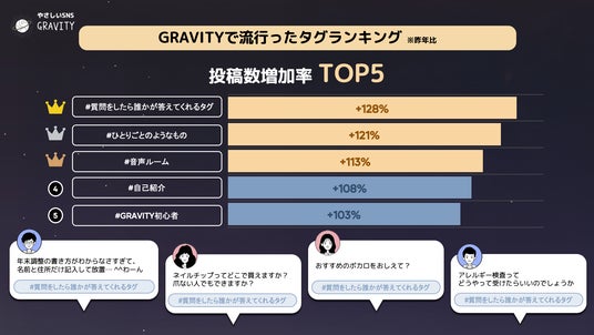 4位「#自己紹介」(昨年比較+108%) 5位「#GRAVITY初心者」(昨年比較+103%)