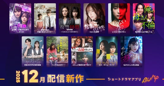 ショートドラマアプリ「BUMP」の開発・提供を行うemole株式会社(本社:東京都目黒区、代表取締役:澤村直道、以下、emole)は、「BUMP」にて、2025年12月、新作のショートドラマ作品11本、『私が推しに壊されるまで~メン地下の罠~』『愛妻弁当は不倫に含まれますか?』『復讐同盟-サレ妻と愛人はクズ旦那を制裁する-』『たまごの復讐』『じゃない方のワタシ』『俺の母さんは不倫してる』『月給300万円の契約結婚』『ベンチのふたり』『わたしが毒姉を捨てるまで』『ロス:タイム:ライフ』『私がわたしを売る理由』を配信開始いたしました。
