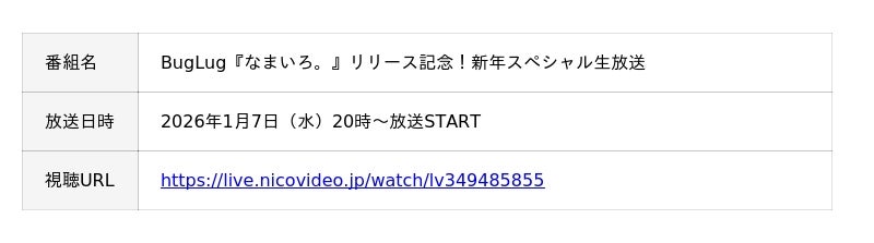 BugLug「なまいろ」リリース記念!新年スペシャル生放送
