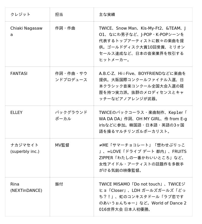 作詞・作曲を手がけたのは、TWICEやSnow Manなど国内外のトップアーティストに楽曲を提供し続けるChiaki Nagasawaと、クラシック音楽の素養を持つ実力派クリエイターFANTASI。サウンドプロデュースはFANTASIが担当し、バックグラウンドボーカルにはTWICEのバックコーラスやKep1er「WA DA DA」の作詞を手がけたELLEYが参加している。