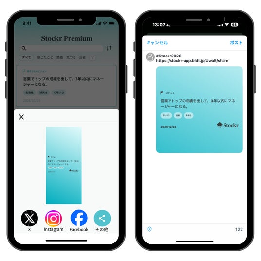 株式会社ビルディット(所在地:東京都八王子市、代表取締役:富田陽介)は、提供する振り返りノートアプリ「Stockr(ストッカー)」において、新年の抱負や目標、理想の自分を外部へ共有できる新機能「ビジョンシェア機能」を2025年12月19日にリリースしました。本機能では、設定したビジョンを家族や友人、SNSなどに共有することで、目標や理想の自分の実現に向かう行動を続けやすくします。